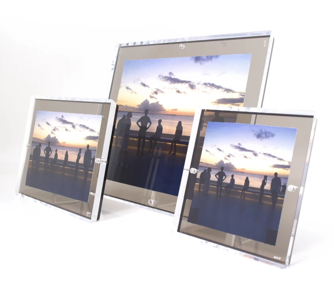 The Alexandra Von Furstenberg Acrylic Snap Frames get their name because they’re a snap to use.