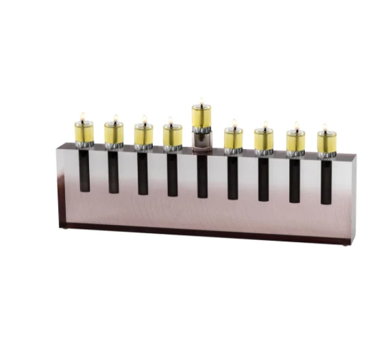 The menorah’s shamash is a removable acrylic piece that can be placed in the center, on the left holder, or left off entirely, making it customizable.