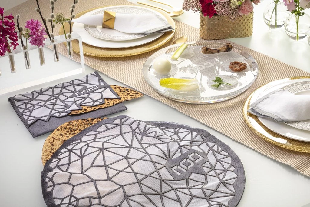 This modern geometric cover can ship immediately and help you make your Passover table special for your family this Passover.