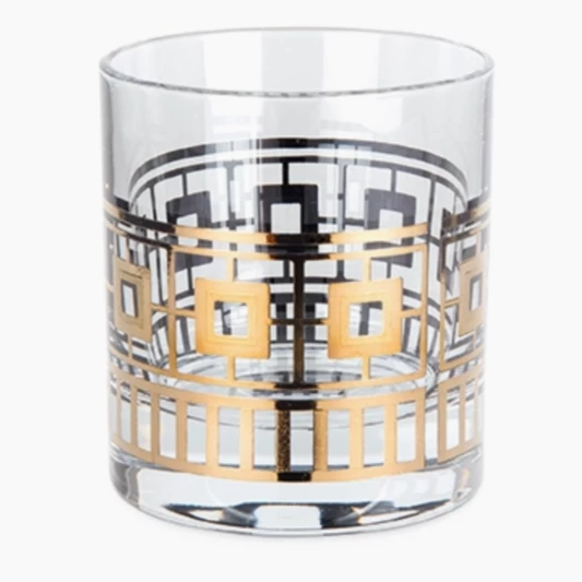 These festive glasses are made of fine crystal and have a screen printing that prevents them from tarnishing. Black and gold with textured golf overly pattern. They make a great gift.