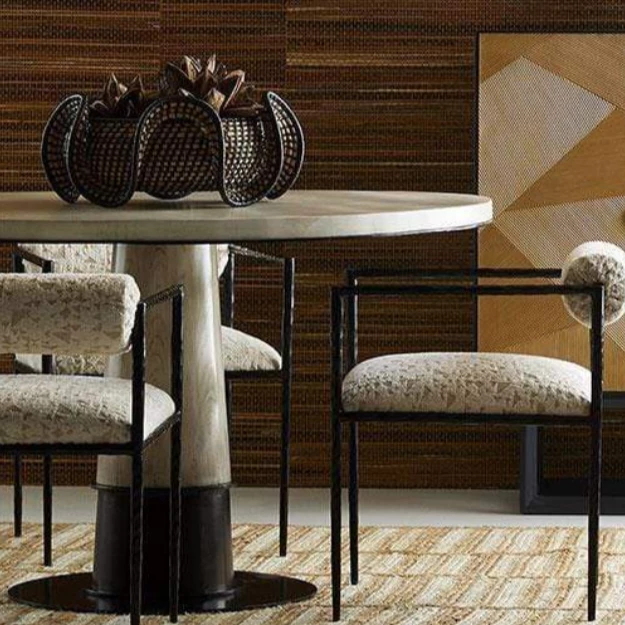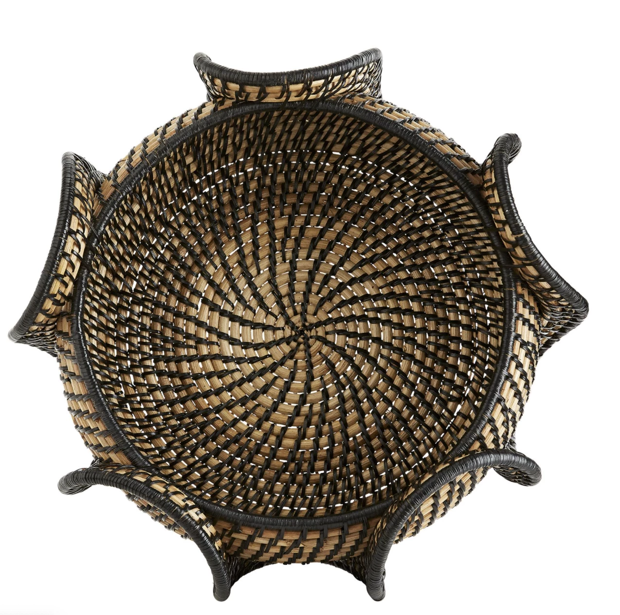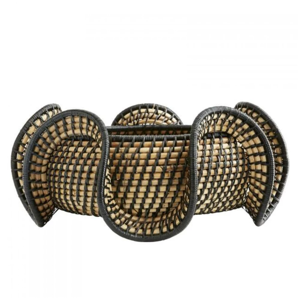 The hand crafted centerpiece has a unique concentric form. Natural and black-stained rattan make this an ideal addition to any table.