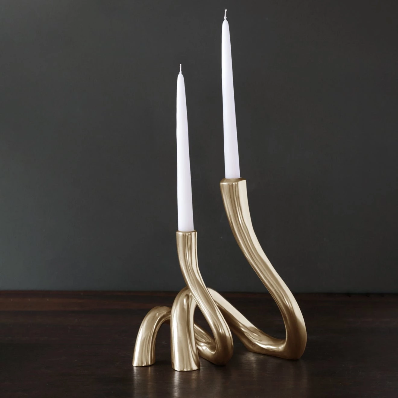 A striking set of sculptural candlesticks. Each piece is sold separately and when the 2 come together they are a dynamic duo.