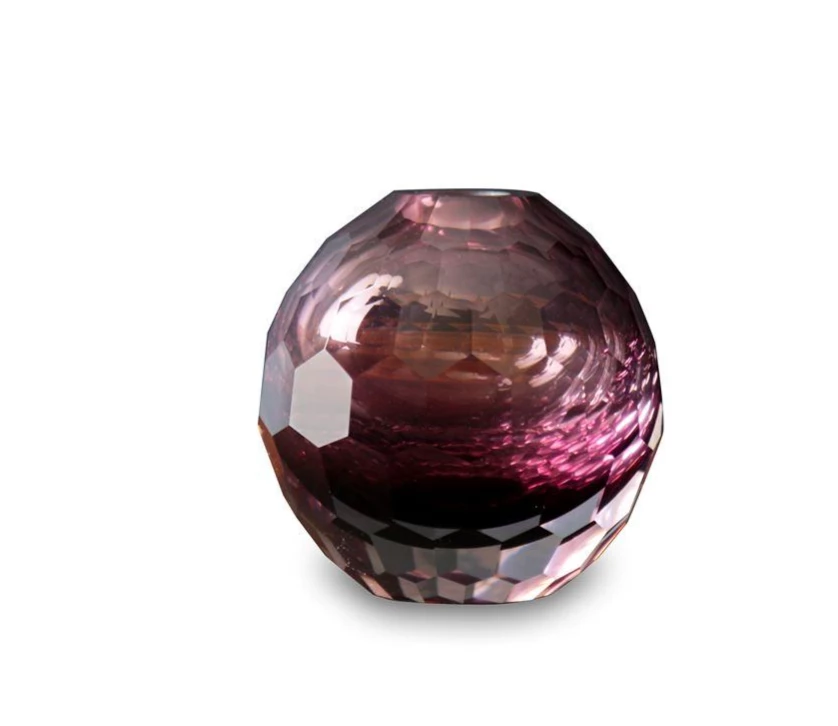These faceted bud vases in amethyst are beautiful alone on a side table or as a collection with all three sizes. The faceted glass is hand-cut by artisans and each piece catches the light and adds decorative sparkle wherever it is placed.