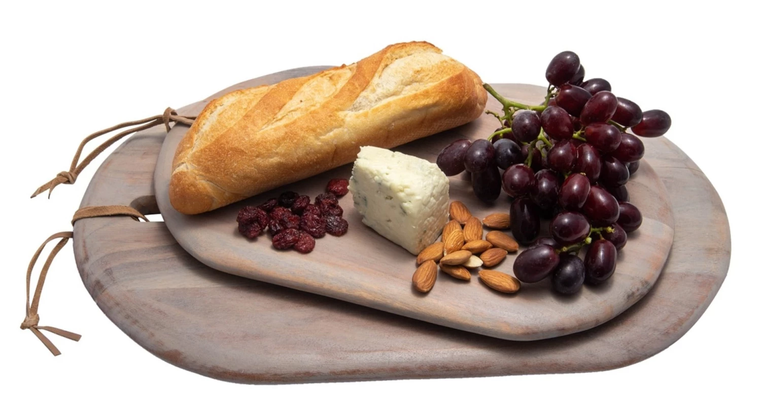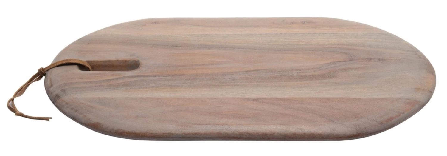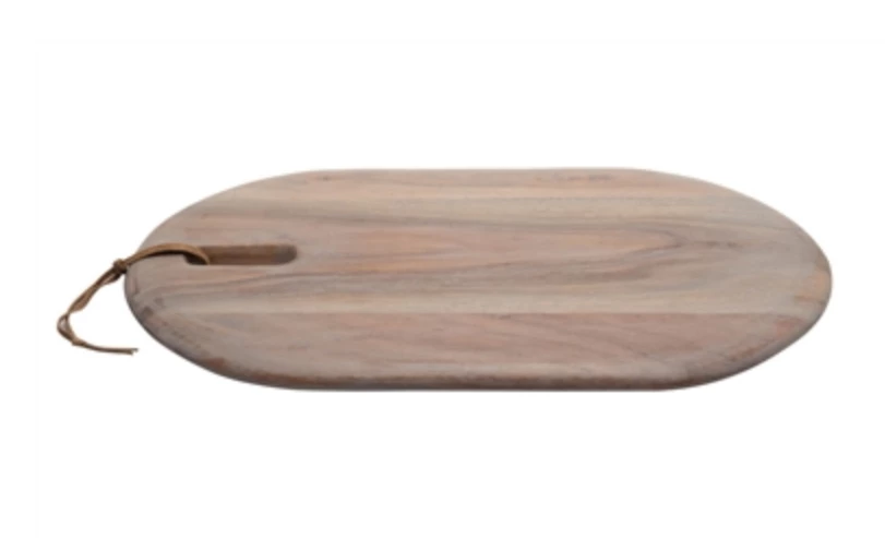 This acacia wood board has a cool leather strap and lime wash to give it a greyish color. Makes a great gift or use at your next social gathering.