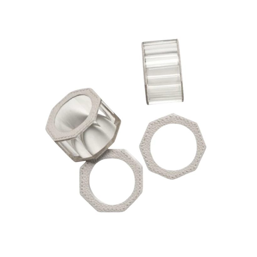 Sleek and sophisticated, these crystal napkin rings have a full grain leather edge detail. They can be dressed up or used casually. Variation to be expected.