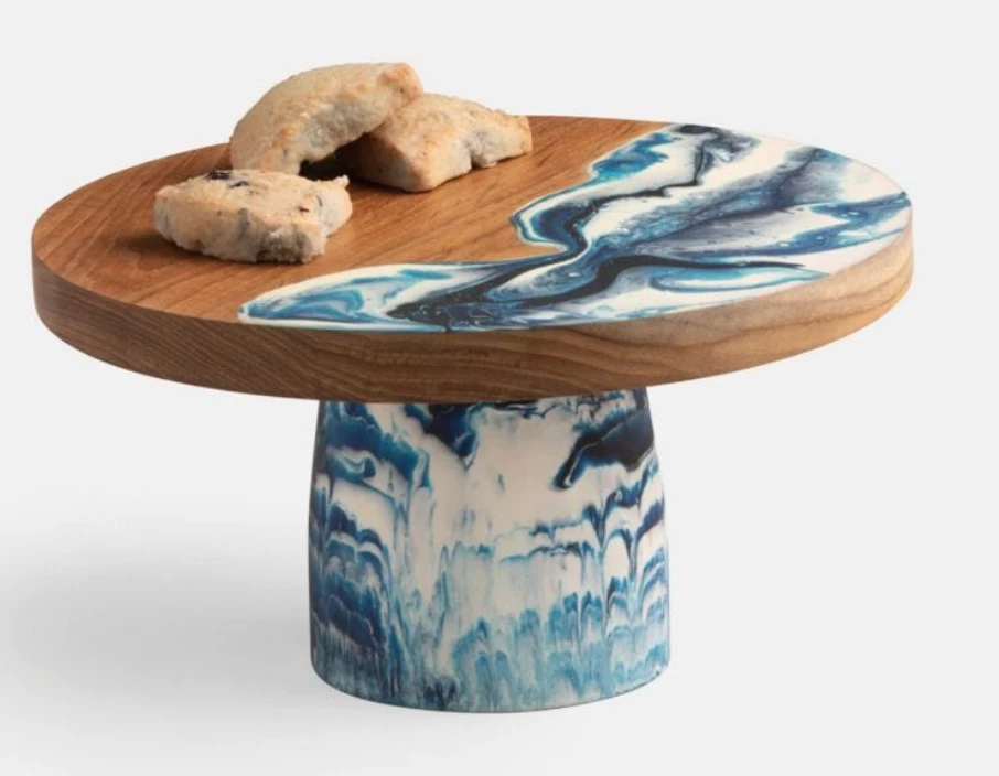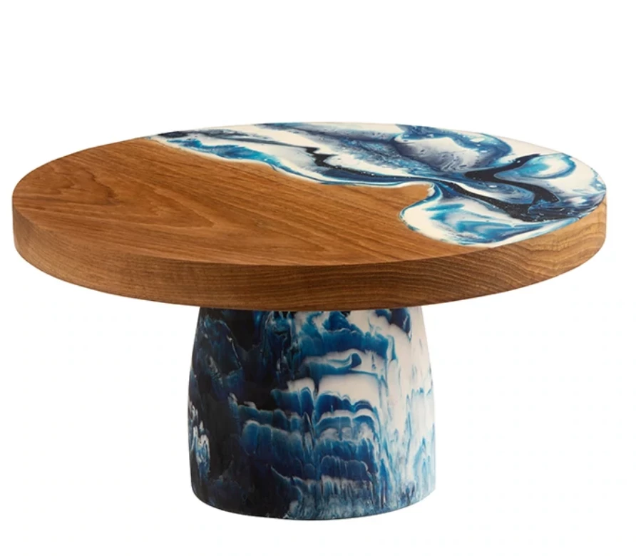 Teak and resin are handcrafted together, bringing a splash of color to this two-tone cake stand. Hand-dipped, each piece is one-of-a kind.