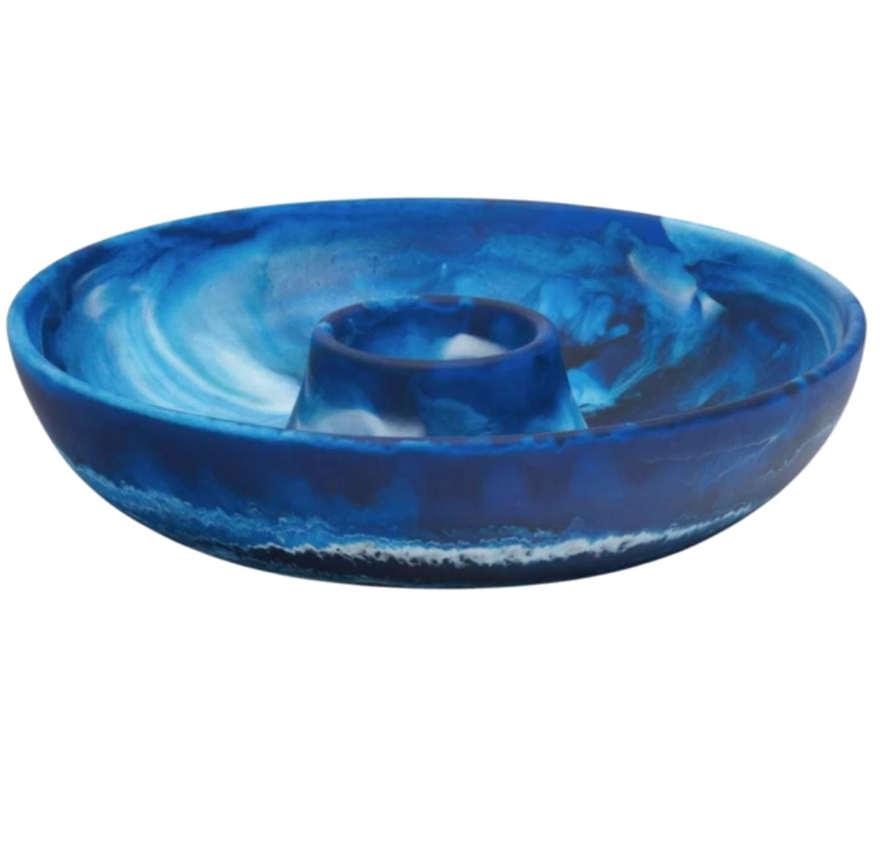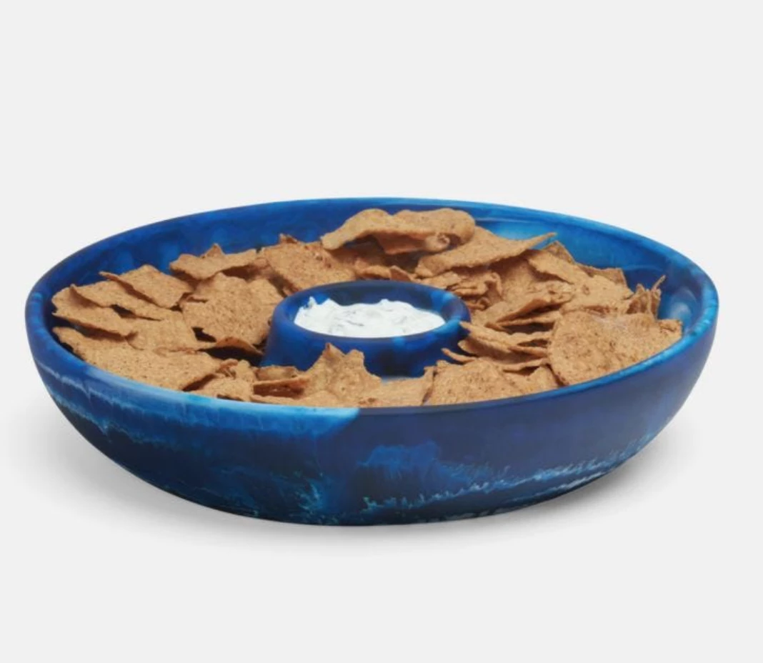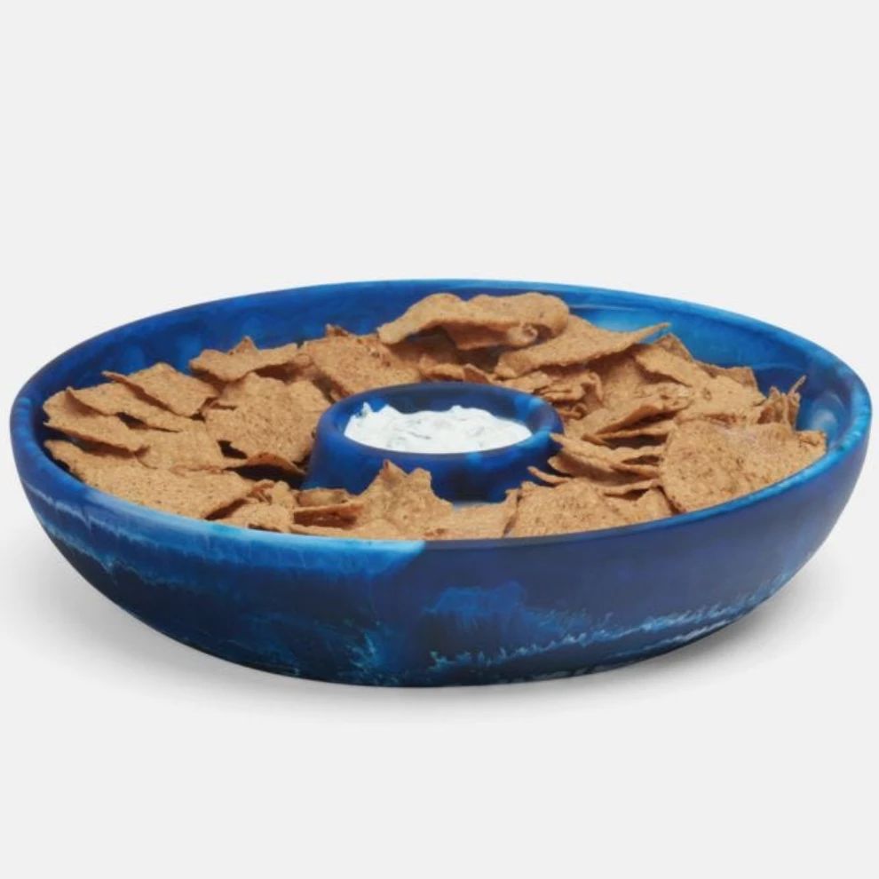 This high-contrast swirled resin bowl is the epitome of super-hip, made for chips and dip, or to display fresh fruit, centerpiece arrangements, and more.