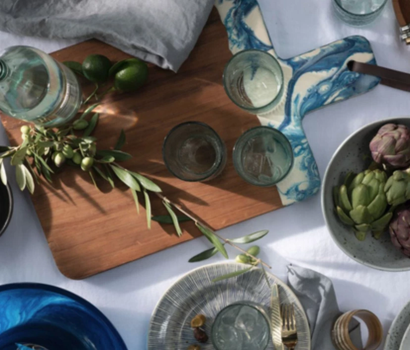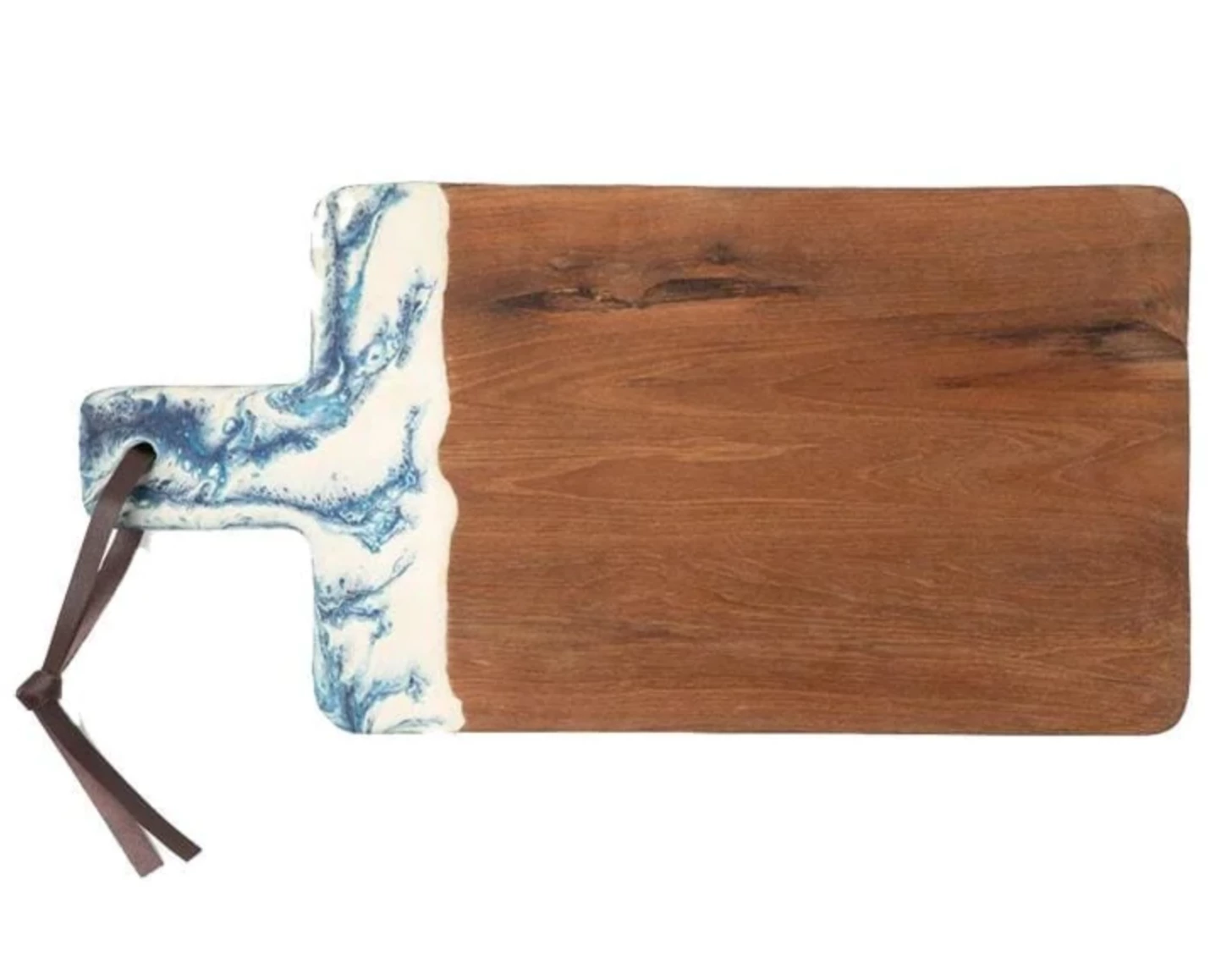 Teak and resin, two materials handcrafted together, bring a splash of color to any setting. A unique two-tone, hand-dipped piece, no two boards are exactly alike. Finished with a leather strap.