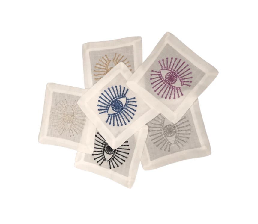 All eyes will be on these great linen cocktail napkins. Our exclusive set of multi colored napkins includes 6 pieces.