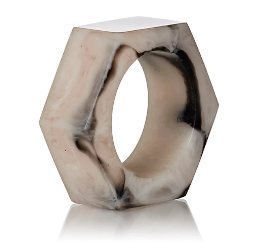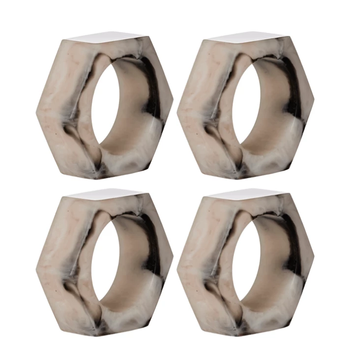 The modern design of the Piper napkin ring has a hexagonal shape and a marble finish in beige and black. A simple ring that works well on many napkins.