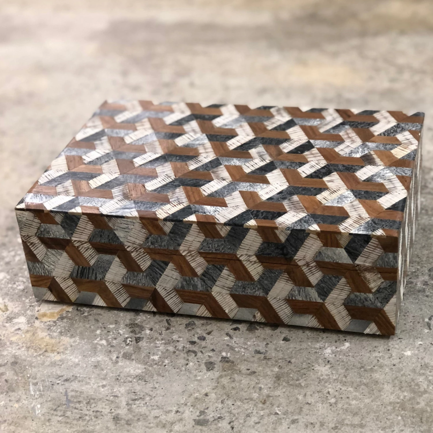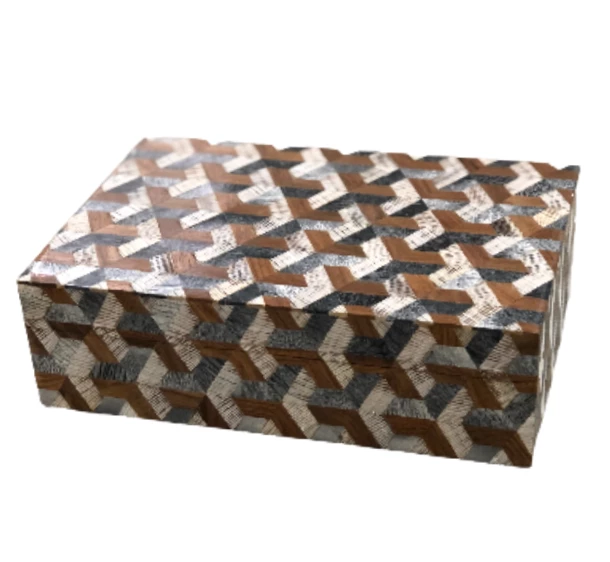 A gorgeous, masculine patterns adorns this hand made box. The perforated bone mixes with solid pieces on cream, brown and charcoal to create the piece of art.