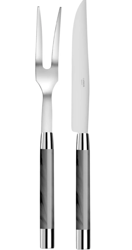 Made of the finest polished 18/10 stainless steel, this Carving Set with grey acrylic handles lends a modern touch to the table.