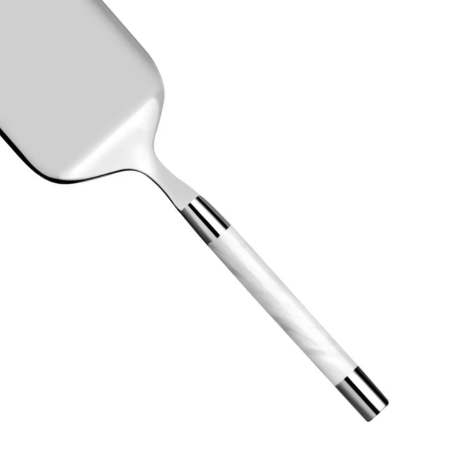 Made of the finest polished 18/10 stainless steel, this must have rectangle sever set has a white acrylic handle that lend a modern touch to the table.