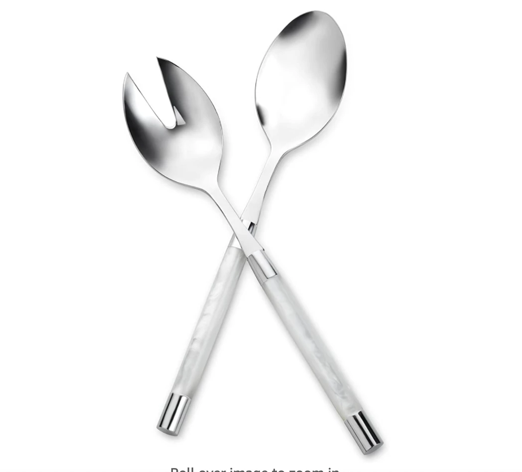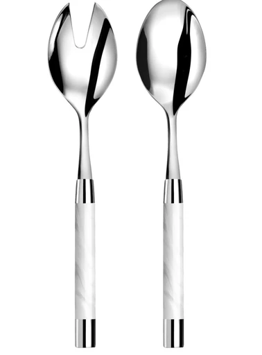 Made of the finest polished 18/10 stainless steel, this salad server set has a white acrylic handle that lend a modern touch to the table.