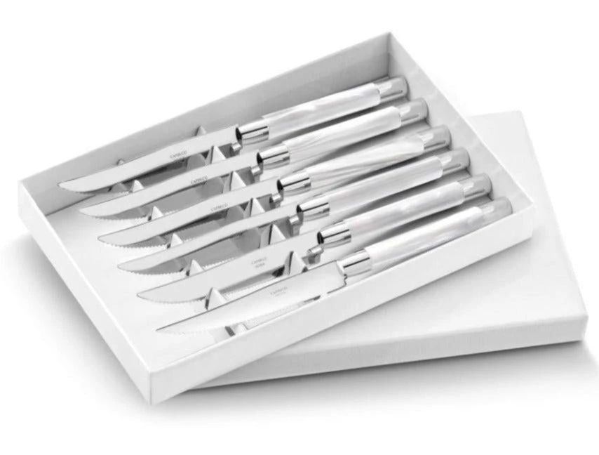 The Steak Knife Set can complement many table settings. Made of the finest polished 18/10 stainless steel they have a white acrylic handles that lends a modern touch to the table and