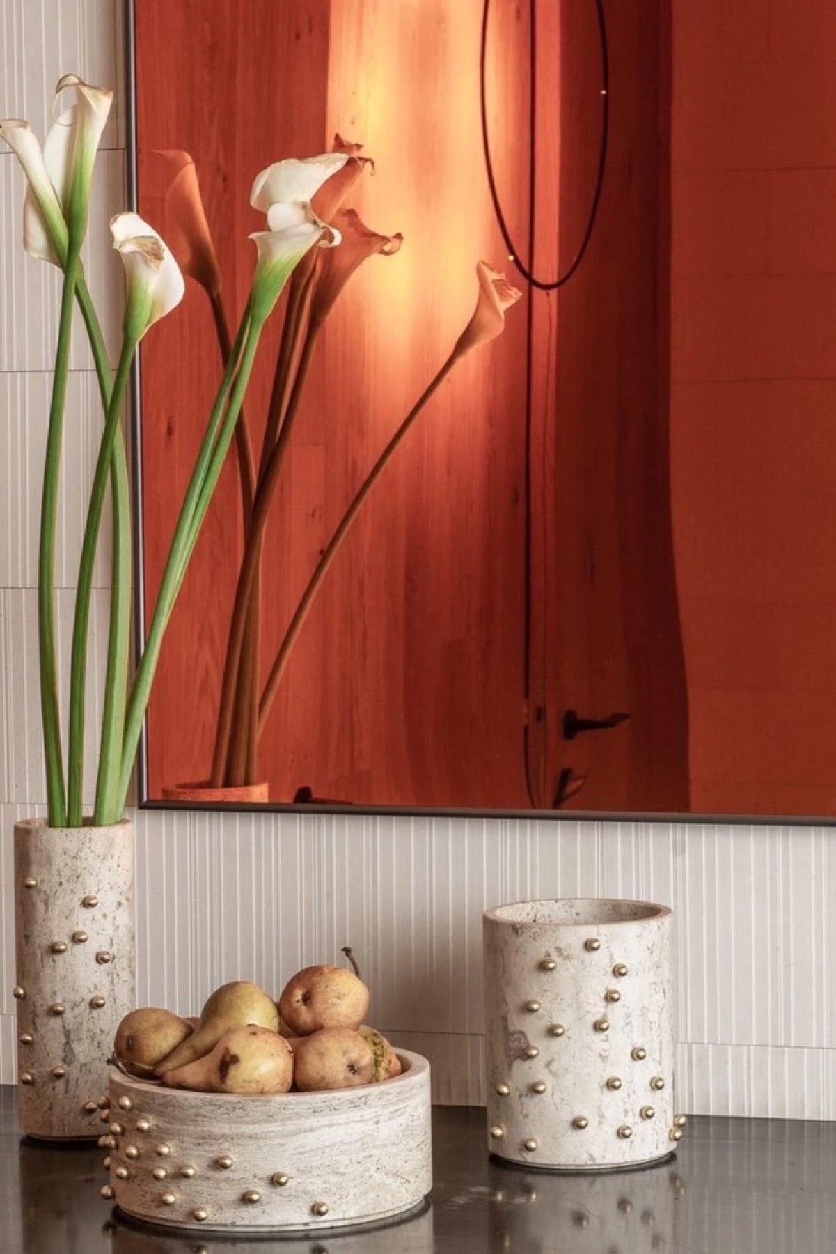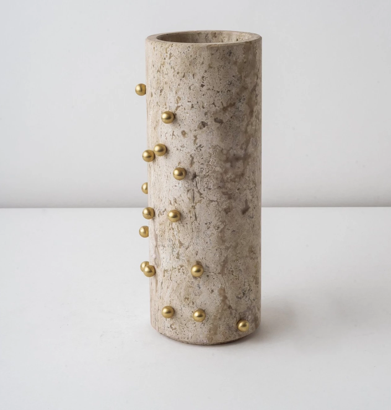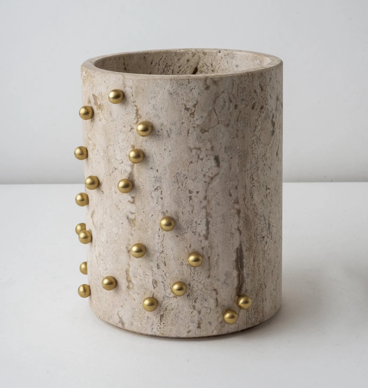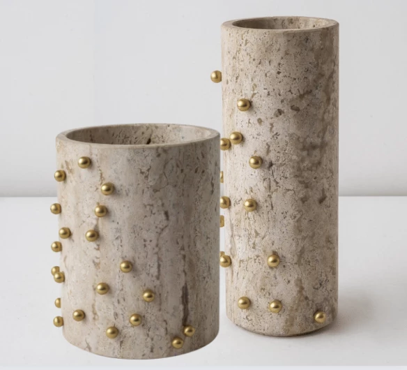These travertine pieces are functional art pieces made with a design in brass studs. They are wonderful examples of artisanal craftsmanship handmade by expert artisans in Mexico. The pieces have been sealed and are watertight to hold flowers