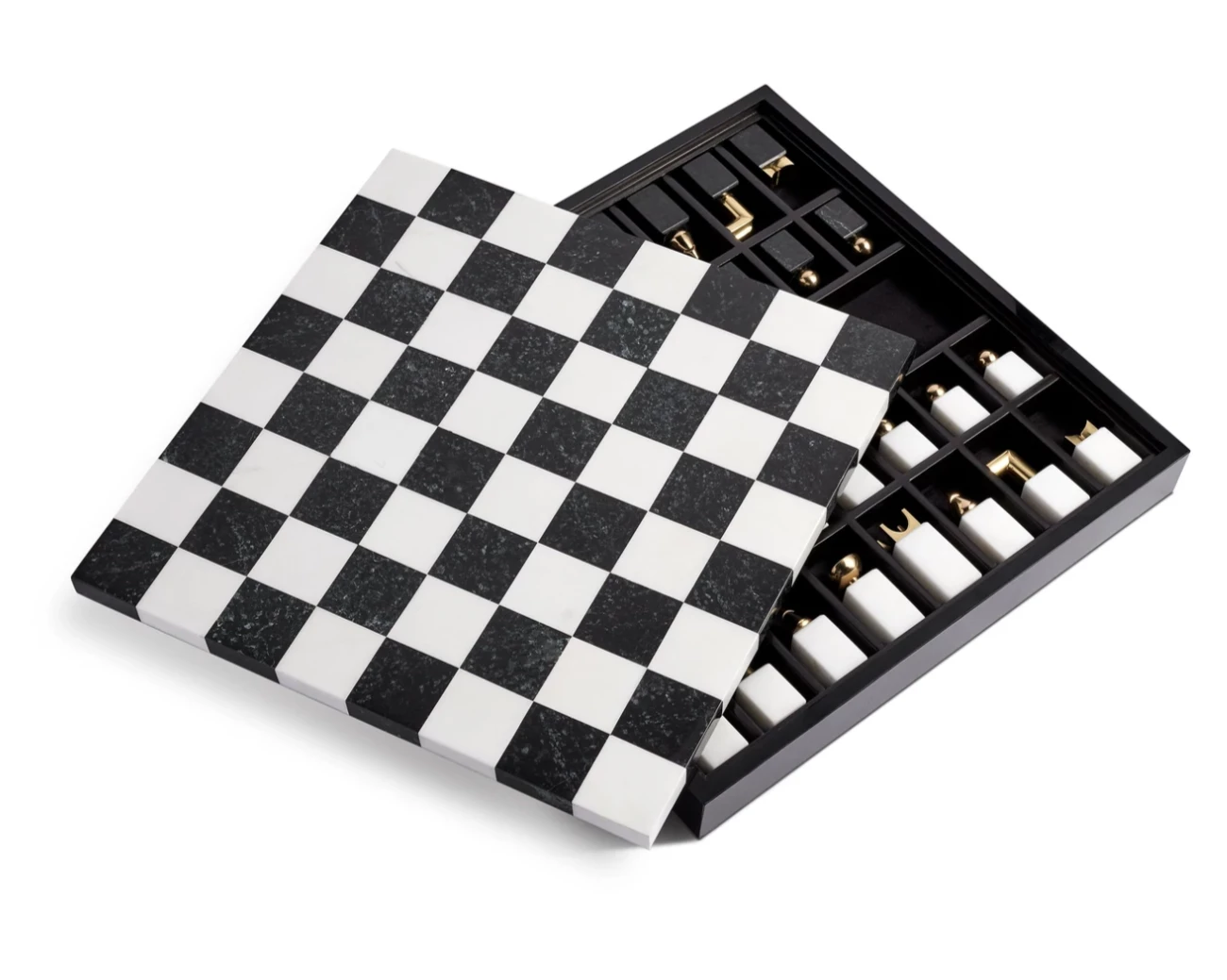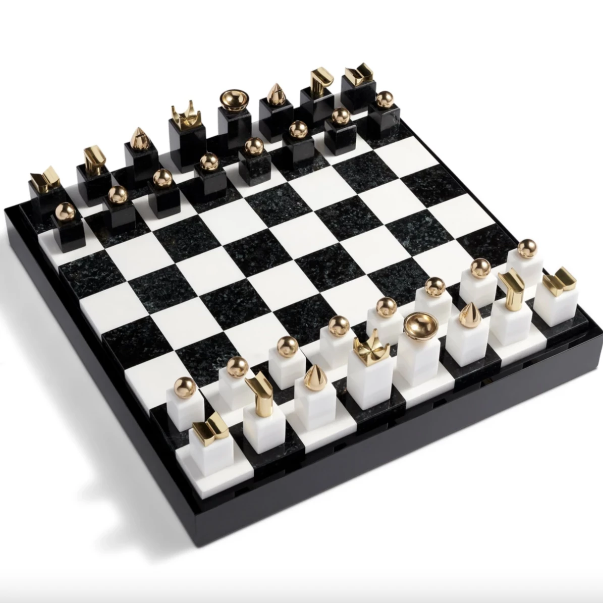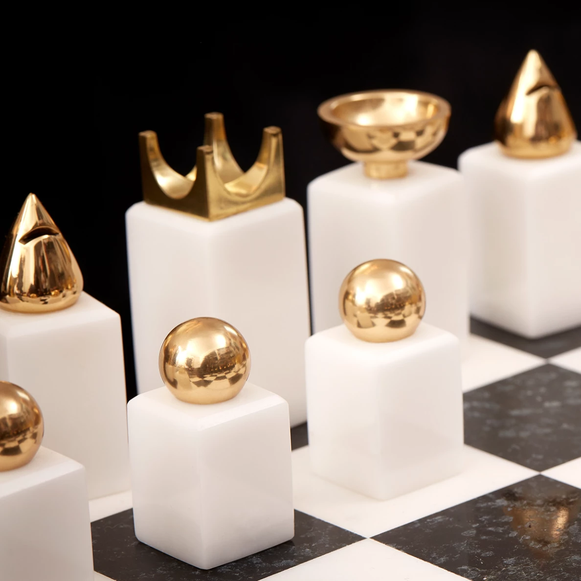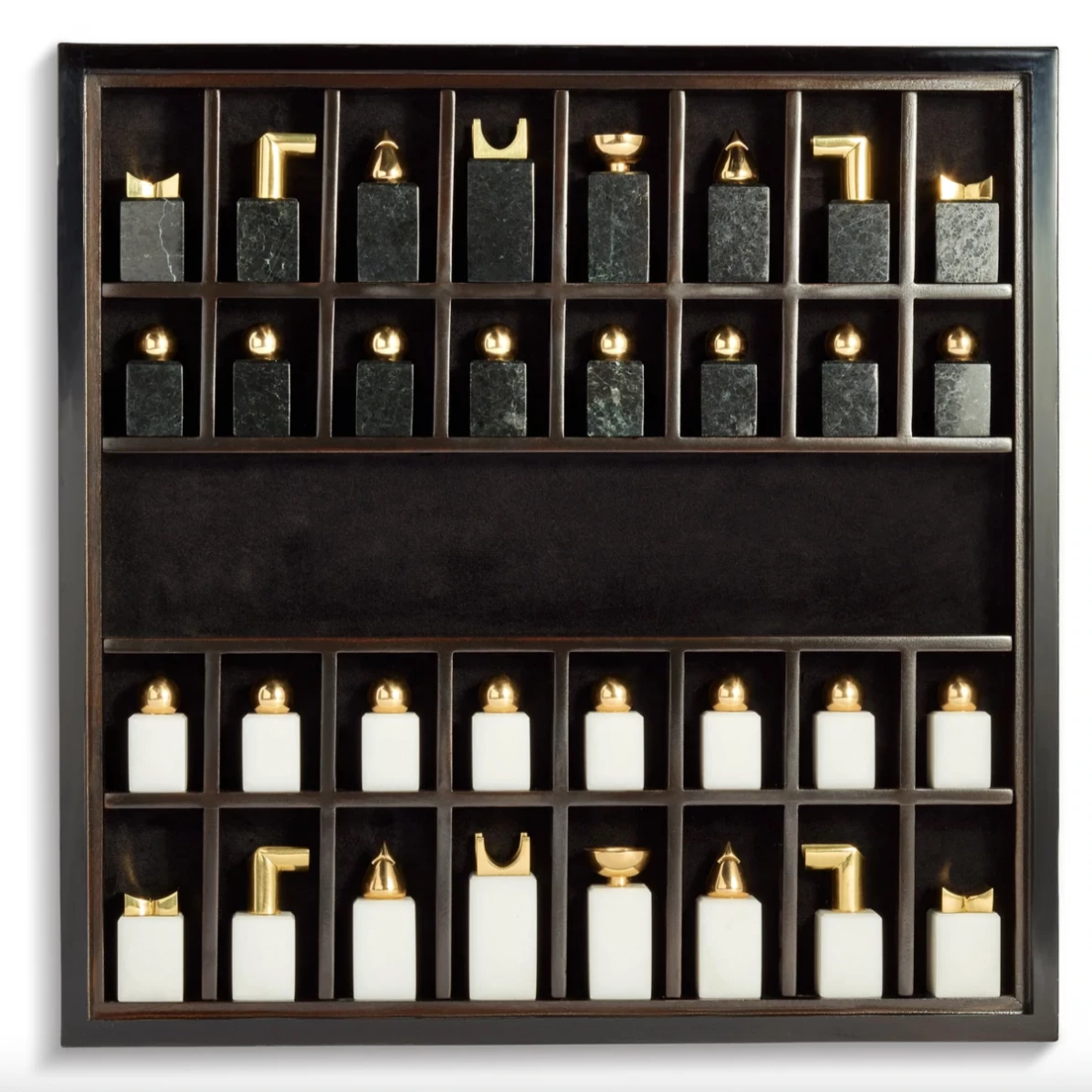 A thoughtful combination of fine textures and finishes, this Chess Set expresses the more playful side of L’Objet. Marble and brass chess pieces are abstract interpretations of the iconic movable objects.