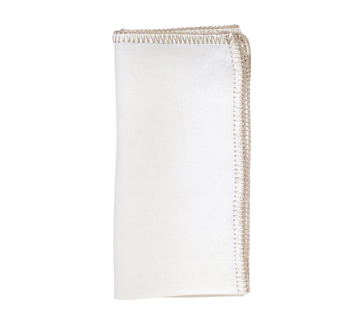 The white linen Crochet Edge Napkin by Kim Seybert features a crisp cloth napkin with an intricate silver crochet edge. With its simple but elegant design is easy ready to be opened and used at every opportunity. The perfect white linen napkin for a classic, sophisticated table at a dinner party or holiday table.