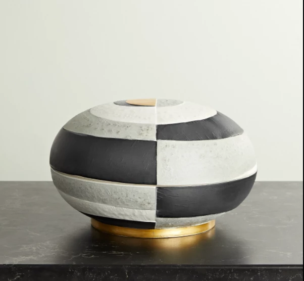 In Cubisme, abstracted forms are remodeled with concrete simplicity into decorative pieces for the home. Finely-textured vases, table lamps, floor lamps and a decorative box are hand-painted in geometric patterns. Each piece is meticulously crafted from fine earthenware and finished in contrasting black, white and grey matte glazes.