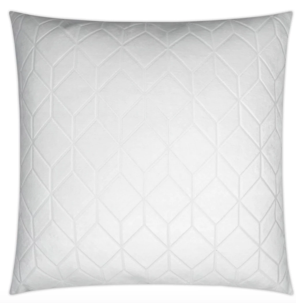 A soft fabric that is comfortable with a geometric design is a fresh white color. The fabric is the same on both sides of the pillow and the pillow has a zipper closure and down insert.