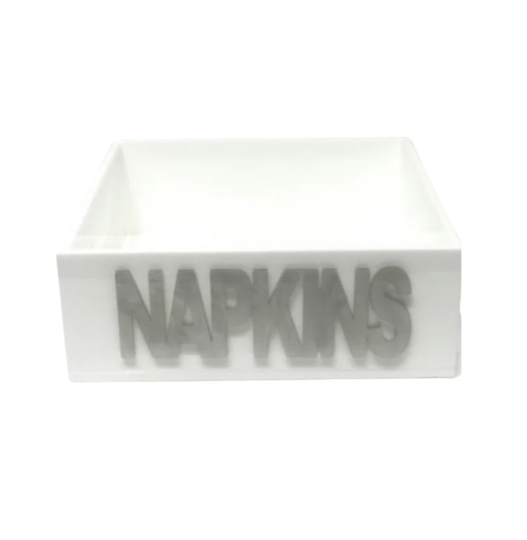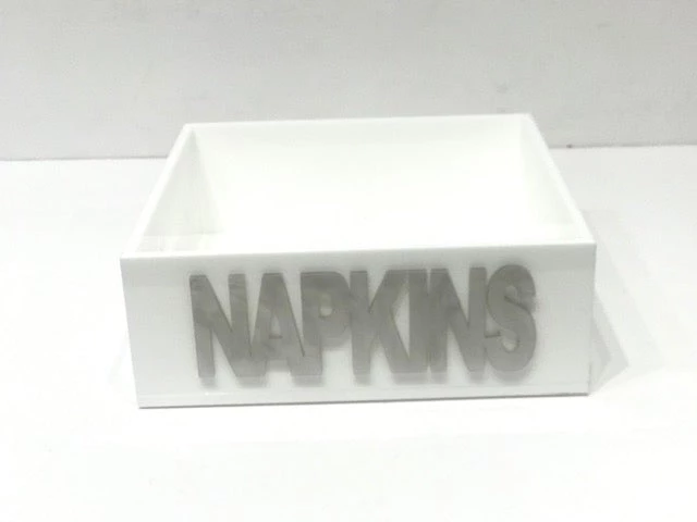 This modern clean napkin holder will look great on your counter top and make it easy to grab a napkin. White acrylic with Silver Marble letters on the front.