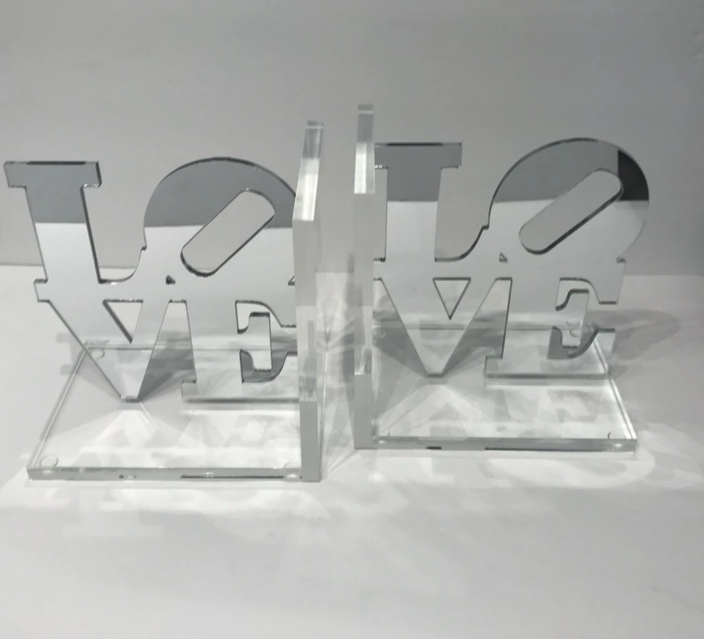 This iconic LOVE design in silver mirror is mounted on a clear base. Design by Eye Candy by Current Home.