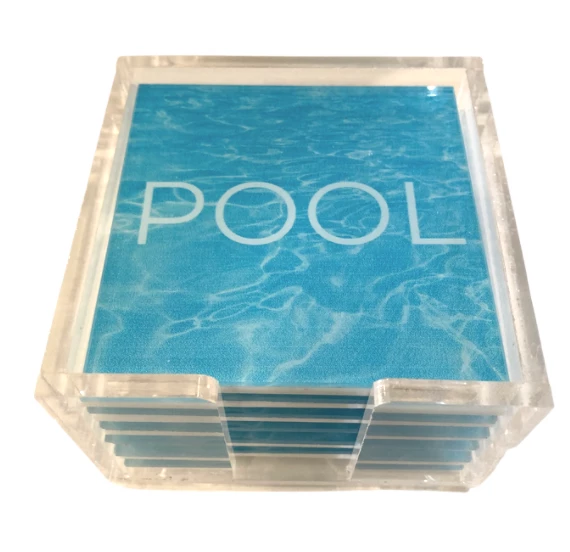 These coasters have a fun pool design and the word POOL on each coaster. The set includes six coasters in a modern acrylic holder easy to bring outdoors.