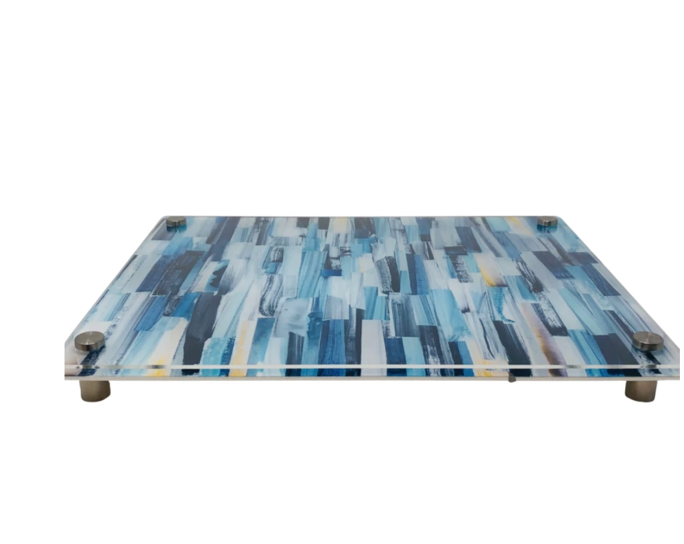 Our newest acrylic board is functional and beautiful. Great to use on Friday nights or can be used to serve sushi, or as a layering piece on a kitchen island. Slightly raised on silver protected feet.