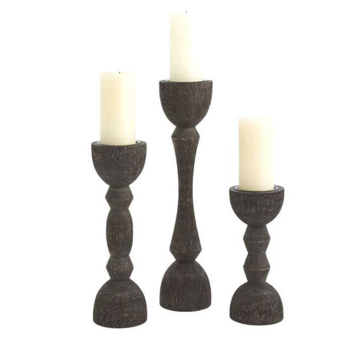Inspired from folk pieces that are part of the collection in the Museum of International Folk Art. These candleholders offer artisanal silhouettes carved from rich wood.