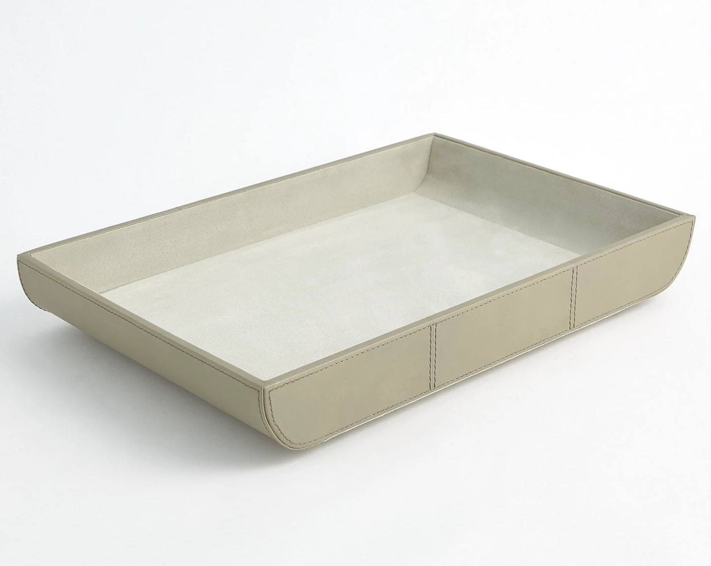 Ivory cowhide leather is used on our Curved Corner Tray. Beautiful stitching creates the simple yet sophisticated design of the tray. Lined with matching suede cloth facbric.