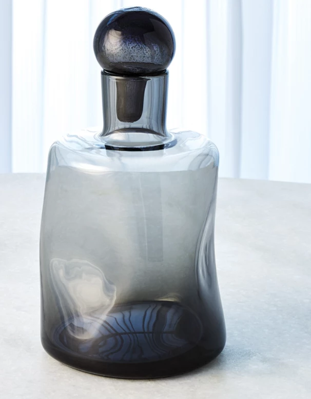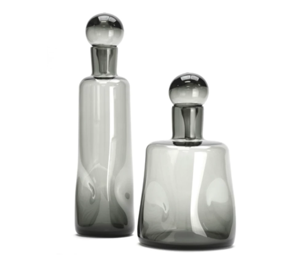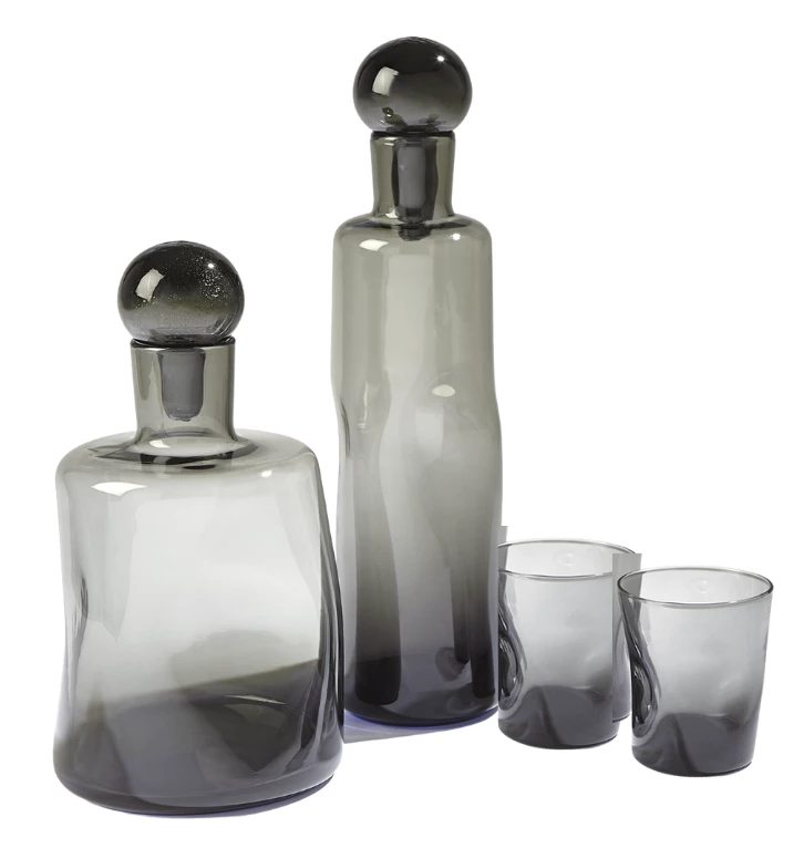 The Pinched Decanters are mouth-blown Italian glassware with pinched detailing, they are airtight for storing liquor and have beautiful DOF glasses available to match.