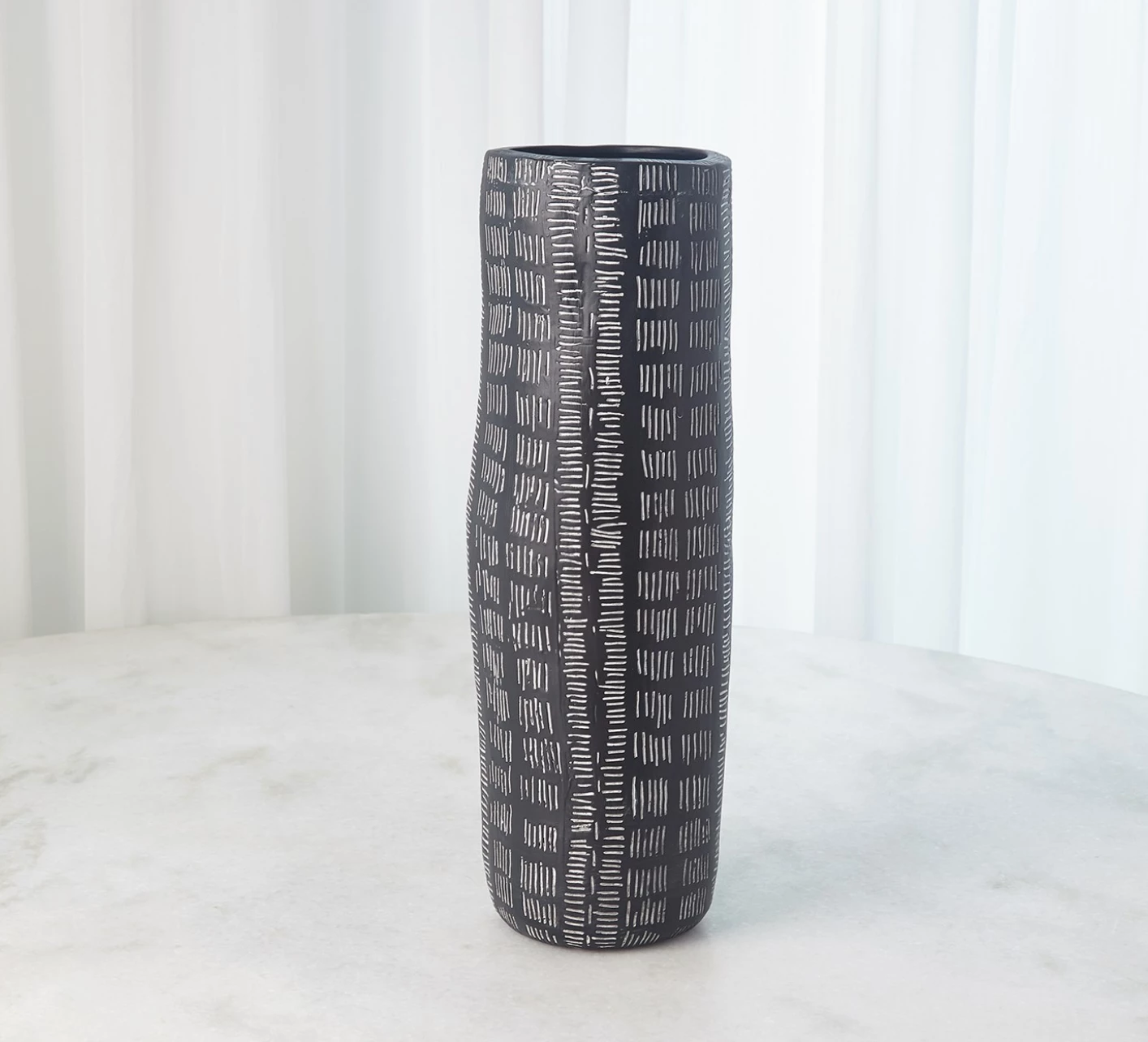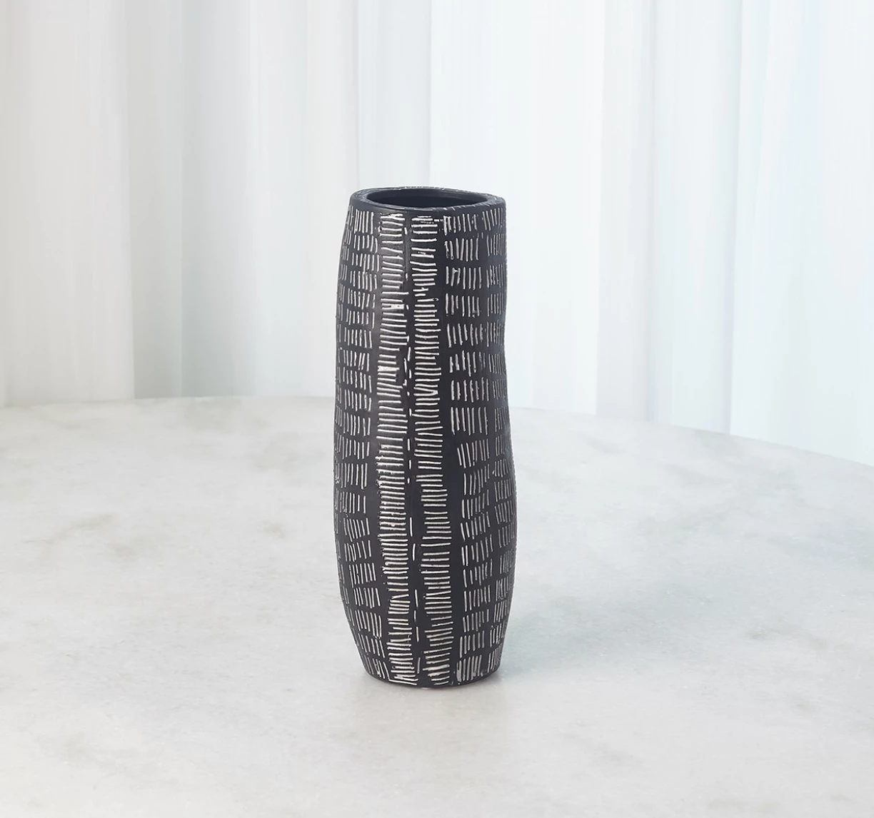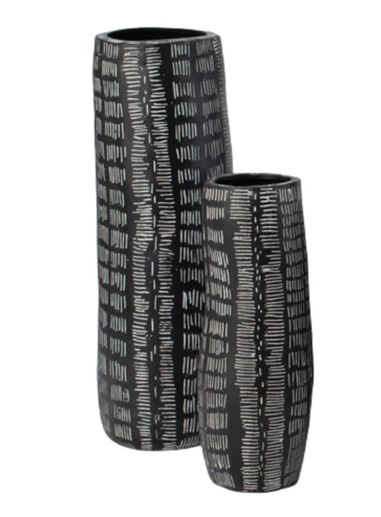 THE QUENCY VASES HAVE AN AFRICAN INSPIRED DESIGN CARVED INTO THE CERAMIC, WHICH ARE GLAZED AND WASHED TO CREATE THE CONTRACT BETWEEN THE PATTERN AND THE BODY. HANDMADE IN ITALY.
