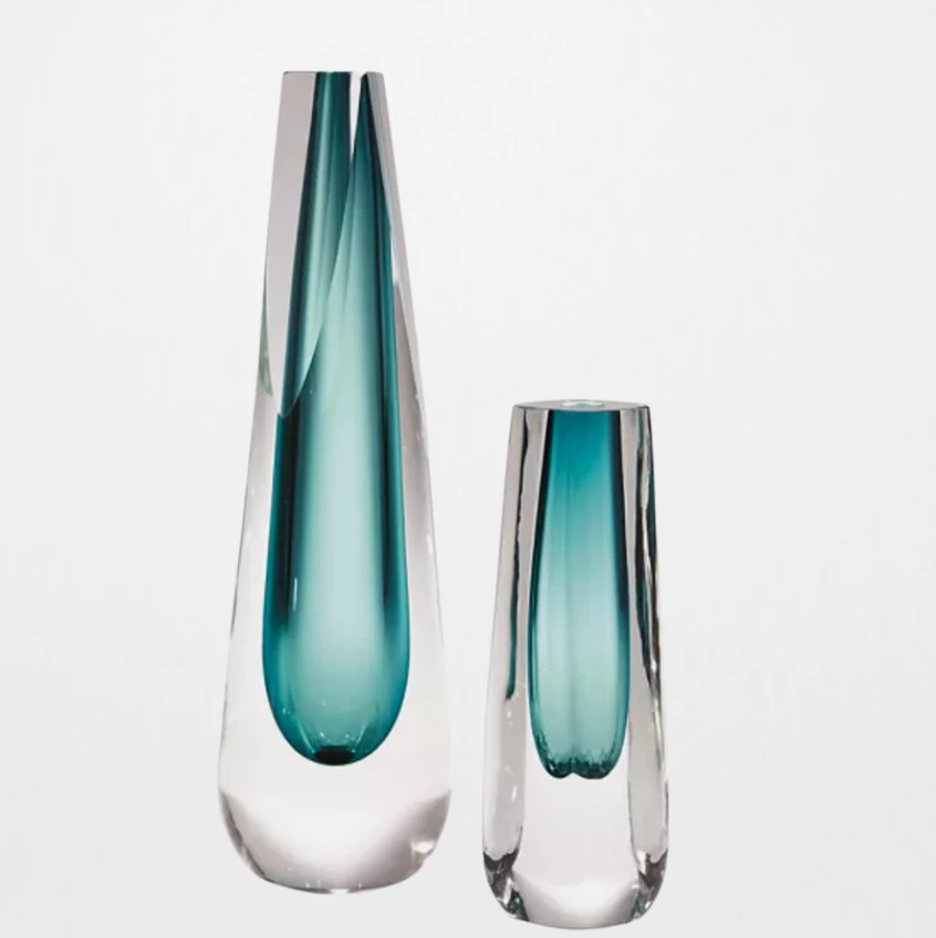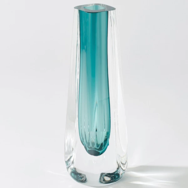 A stunning and substantial vase that can be enjoyed on its own or paired with the Triangle Cut Vase. The incased color is accomplished by blowing colored glass in layers. This vase is hand crafted from thick layers of clear & colored art glass.