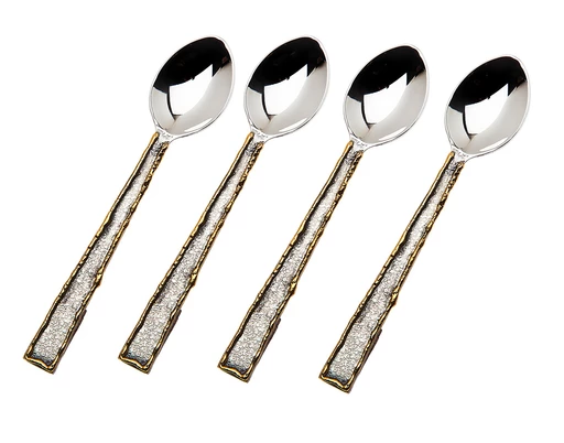 The Golden Frost Dessert Spoon set includes 4 pieces and is perfect coffee time or to add to snack bowls or dip bowls. We love the sophisticated mix of metal on the matte silver plated finish.
