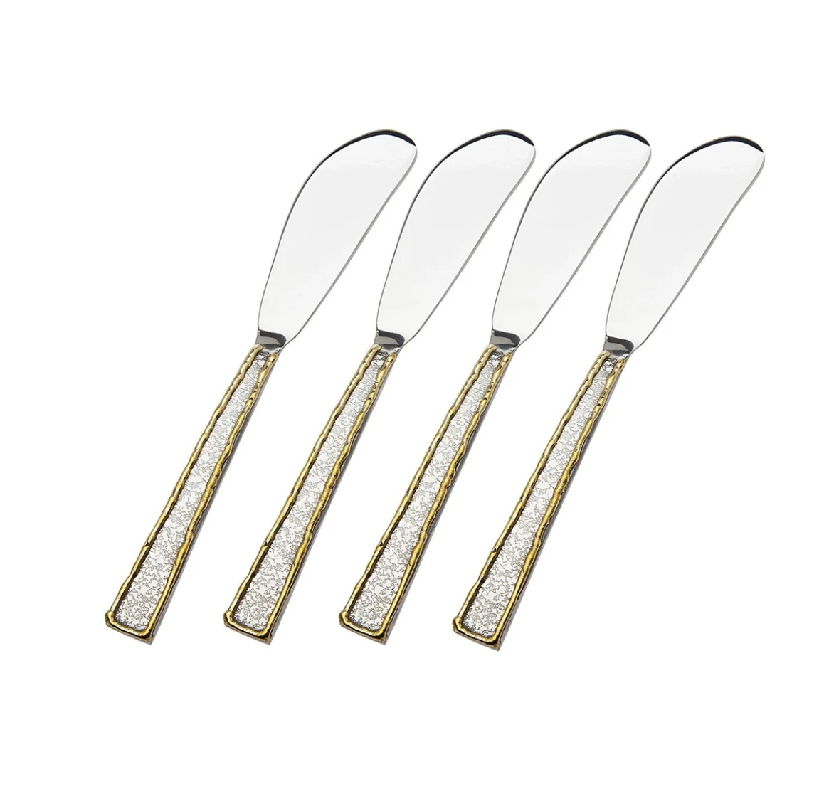The Golden Frost Spreader set includes 4 pieces and is perfect for cheese , snacks and dips. We love the sophisticated mix of metal on the matte silver plated finish.