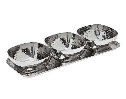 Treat guests to some pre-dinner munchies that are perfectly contained this modern set of 3 square bowls that fit snugly into a matching rectangular tray.