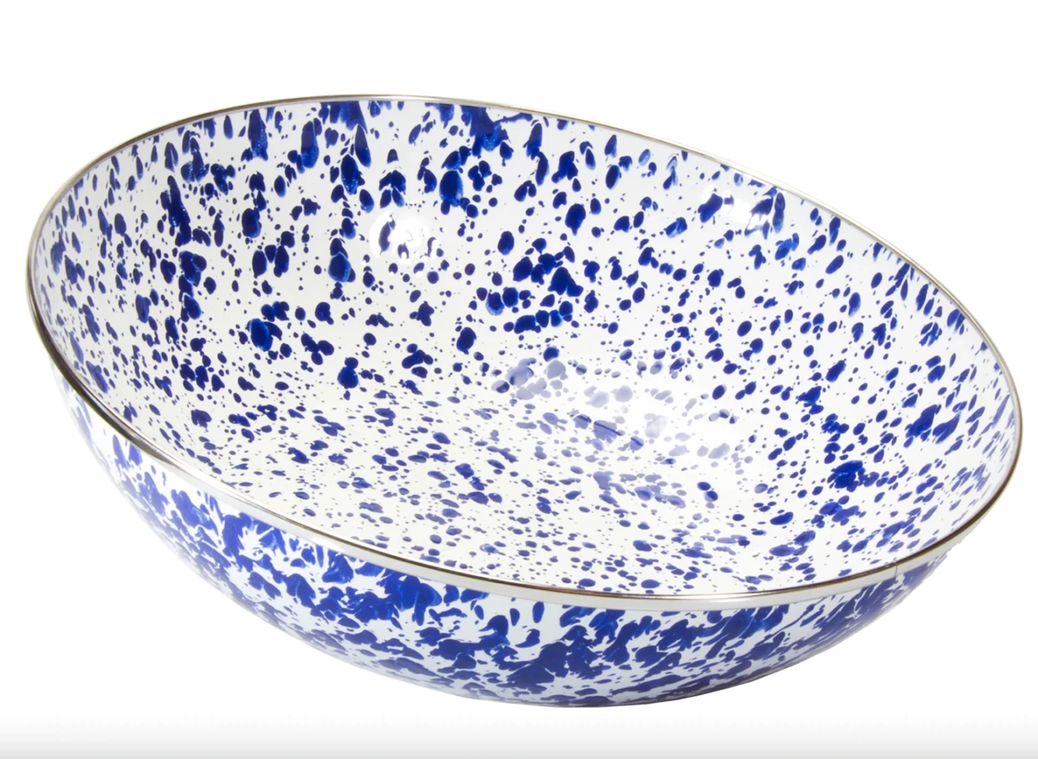 This collection will quickly become your favorite. The enamelware is made of carbon steel coated with a porcelain enamel and trimmed in stainless steel. The large bowl is great for serving