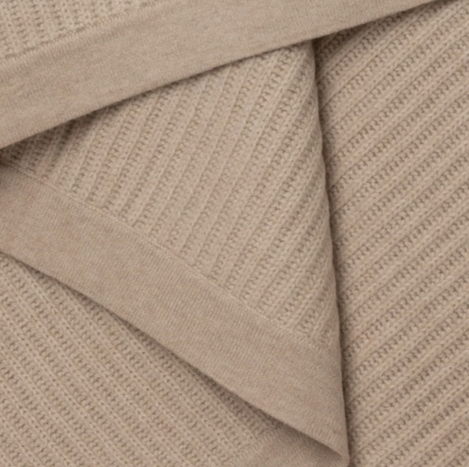 The Fisherman cashmere knit throw in beige has a cream border. Made in Mongolia from hand-combed natural fibers, it is soft and luxurious to the touch.