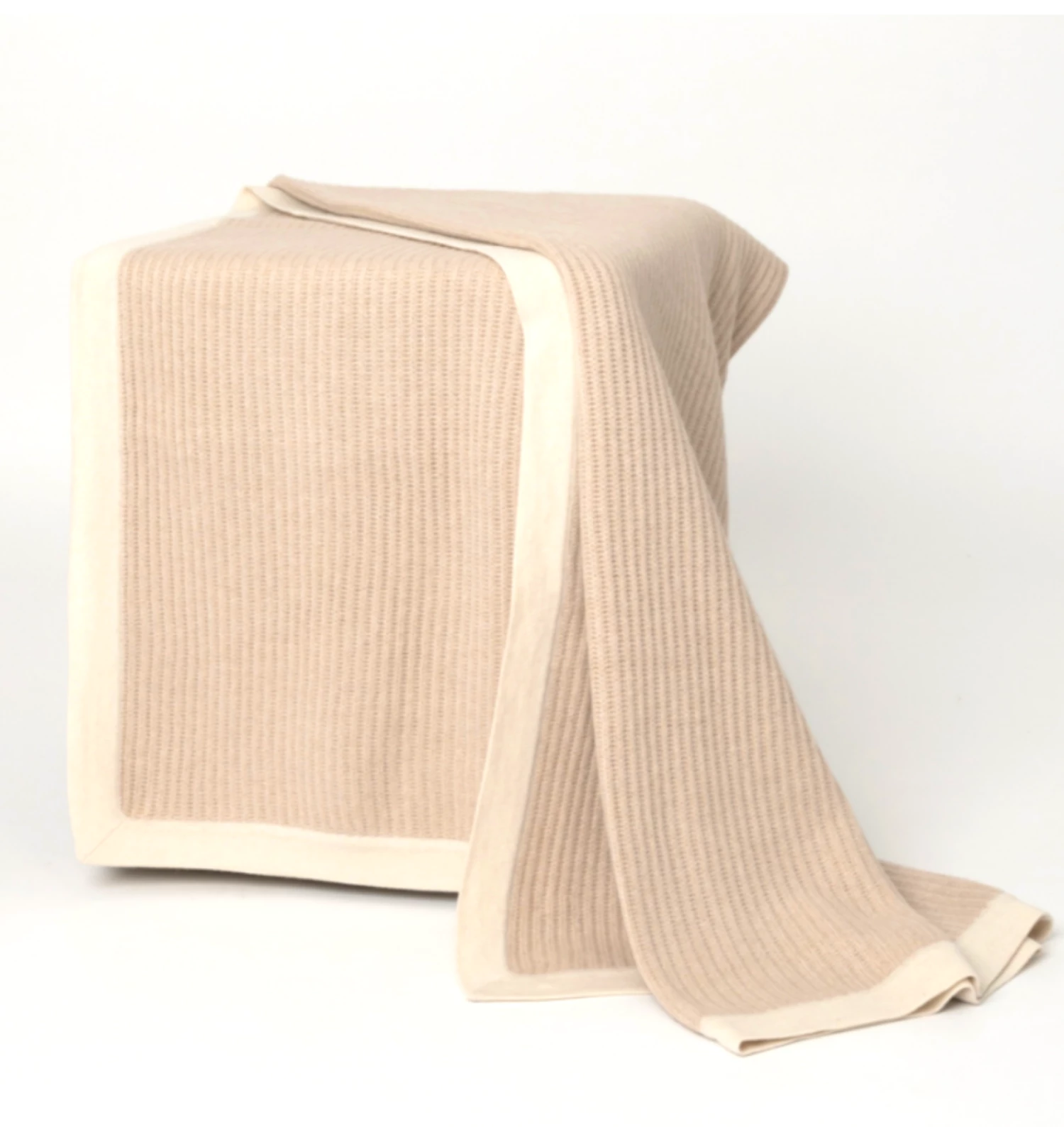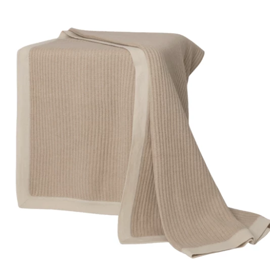 The Fisherman cashmere knit throw in beige has a cream border. Made in Mongolia from hand-combed natural fibers, it is soft and luxurious to the touch.