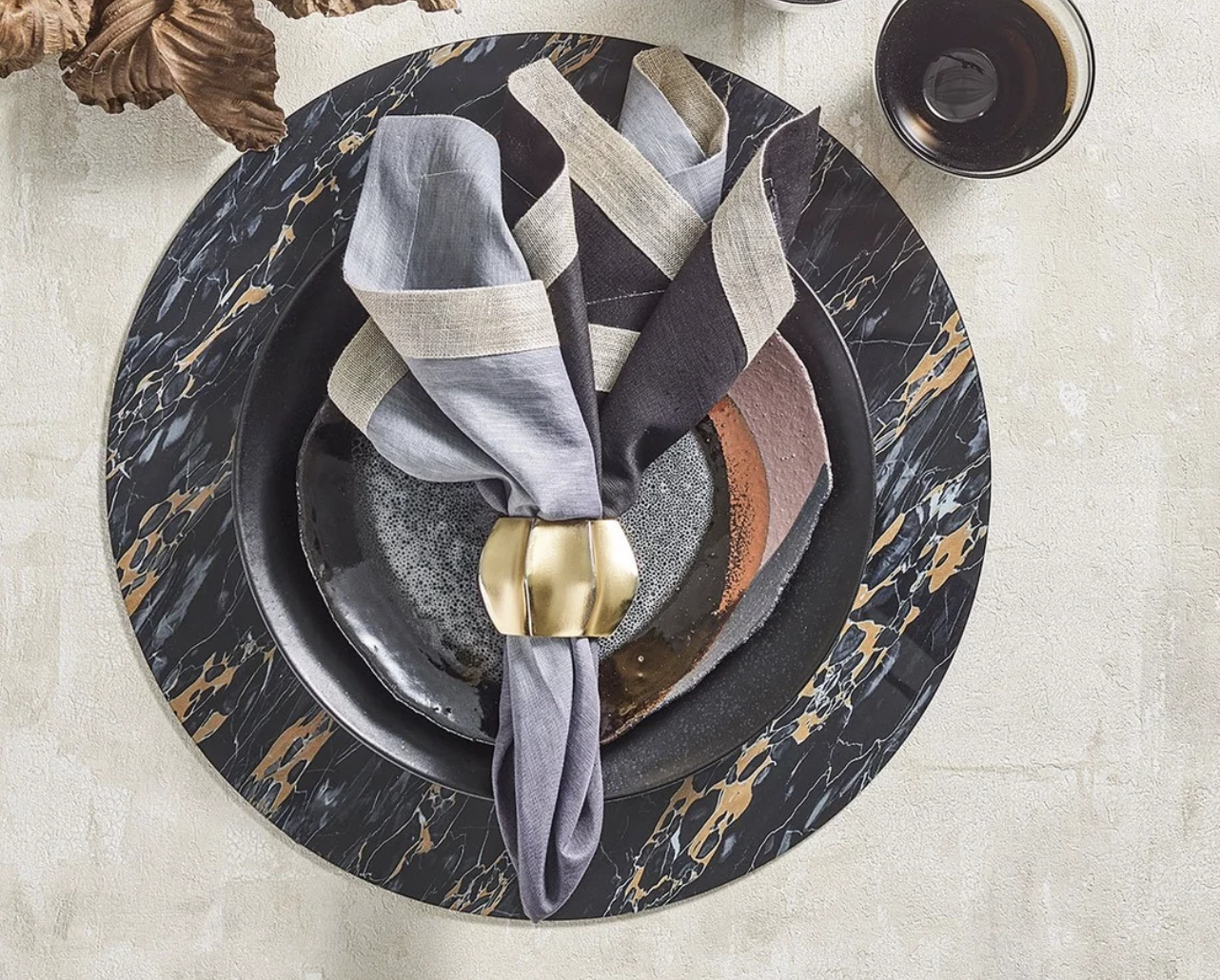 A sophisticated take on the uniform and harmony found within naturally occurring minerals, the versatile Mineral Placemat by Kim Seybert, is perfect for year-round entertaining. Mimicking the raw form of granite, a material produced in volcanic arcs and mountains, the Mineral Placemat features a sleek resin finish atop an organic black granite pattern. Use monochromatic, coordinating linens and metallic textures to elevate this dramatic yet modern look.
