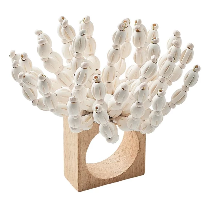 The hand-made, wooden beaded Reed Napkin Ring is the perfect addition to any Summer table setting. Wooden beads are hand-arranged in a sea-inspired spray and sit atop a wooden square base.
