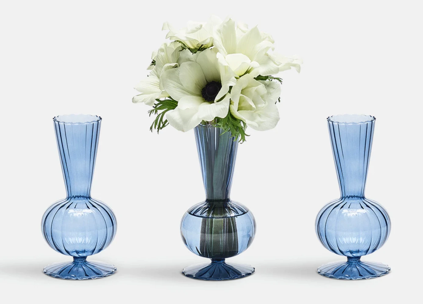 Add these delicate, hand-blown glass vases to your table with fresh flowers. They feature a tapered flute atop a globe and finished with a scalloped base. This stunning glass bud vase adds sophistication to any table. Other colors are available to mix.