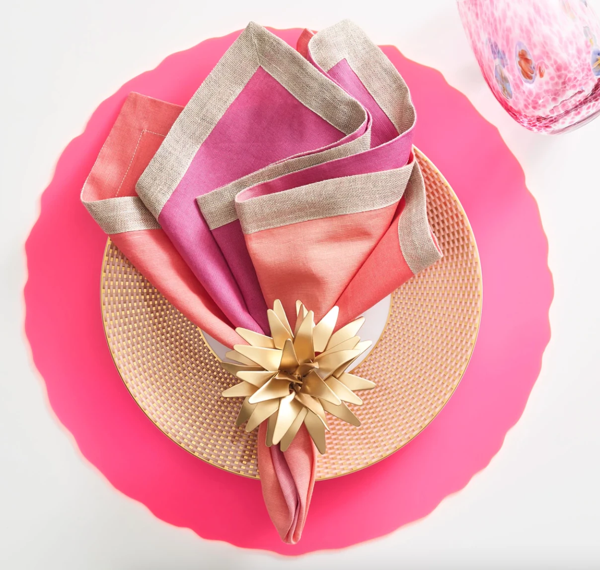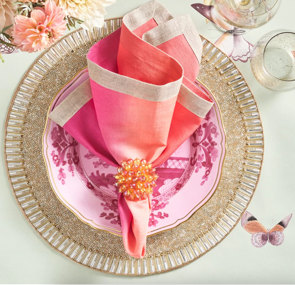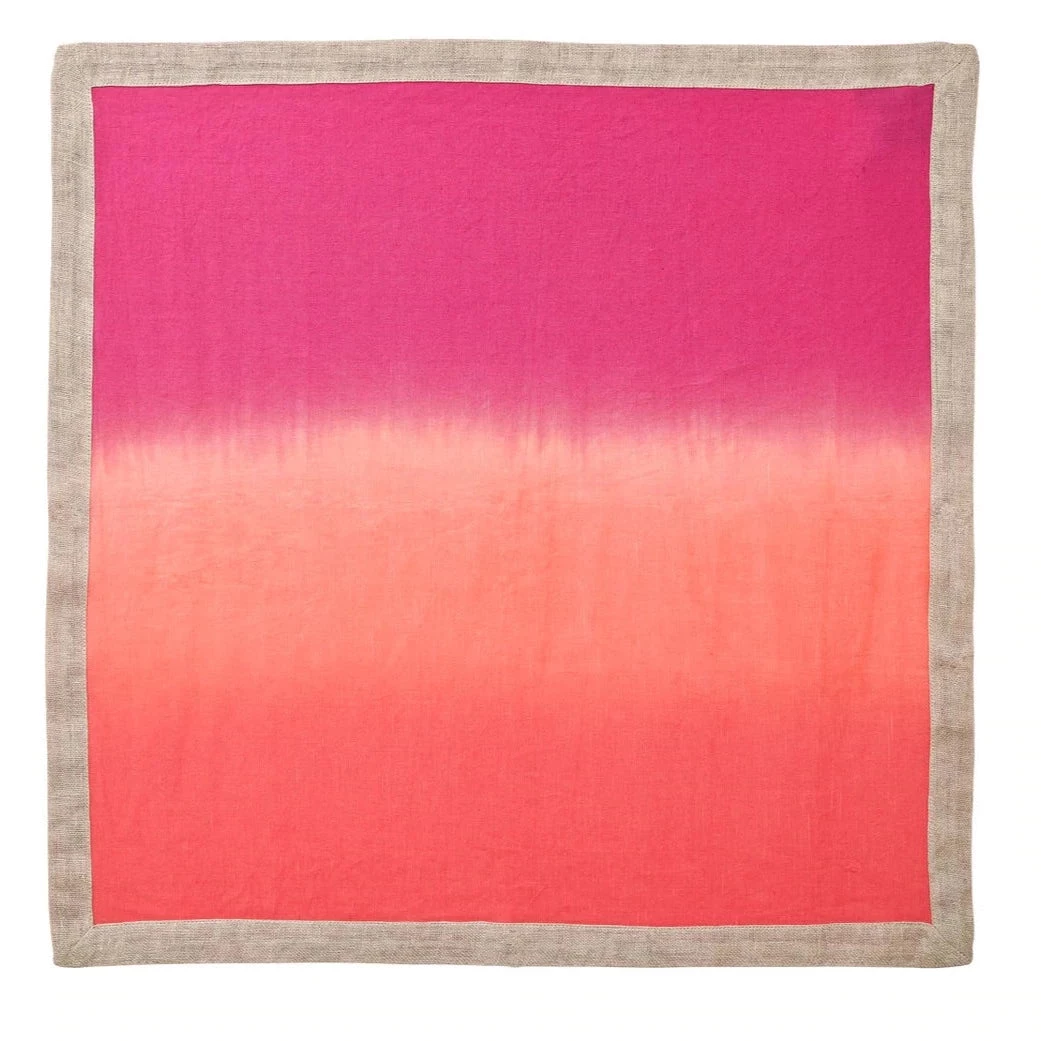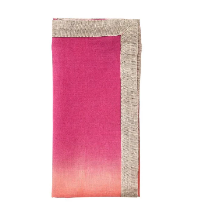 The Linen Dip Dye Napkin from Kim Seybert, features an ombre gradation from fuchsia to orange, adding a subtle elegance to the refined linen napkin. This gorgeous rich color combination complements any festive table. These linen napkins are hand-dipped and dyed and accented with a luxurious metallic foil border.