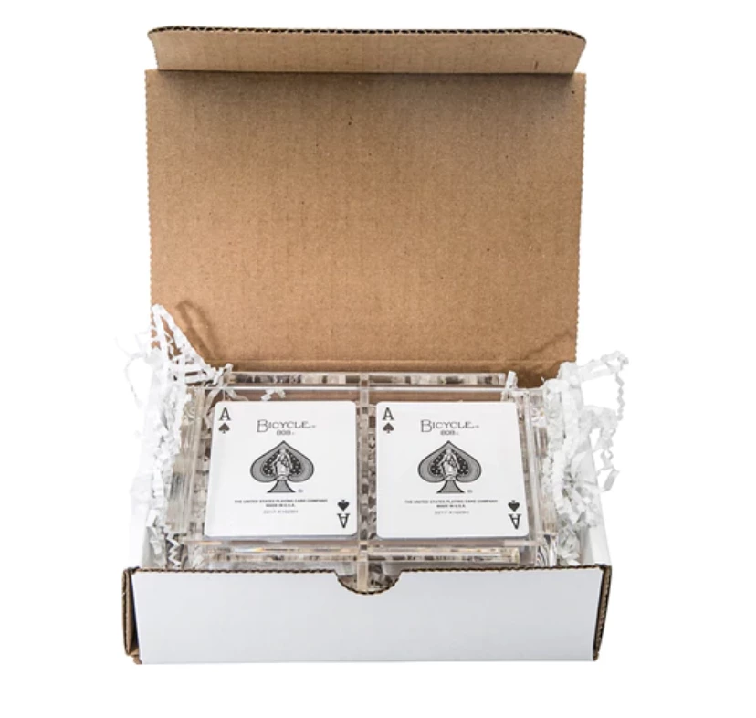 This modern, luxe card deck set make a perfect gift or decor piece. The acrylic holder has a handsome Madagascar Wood top that slides open to reveal two sets of standard index playing cards. Great for poker or bridge.
