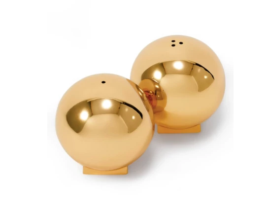 These modern and minimalistic spherical salt and pepper shakers are a stylish addition to a table setting. The polished gold finish also adds a touch of warmth.