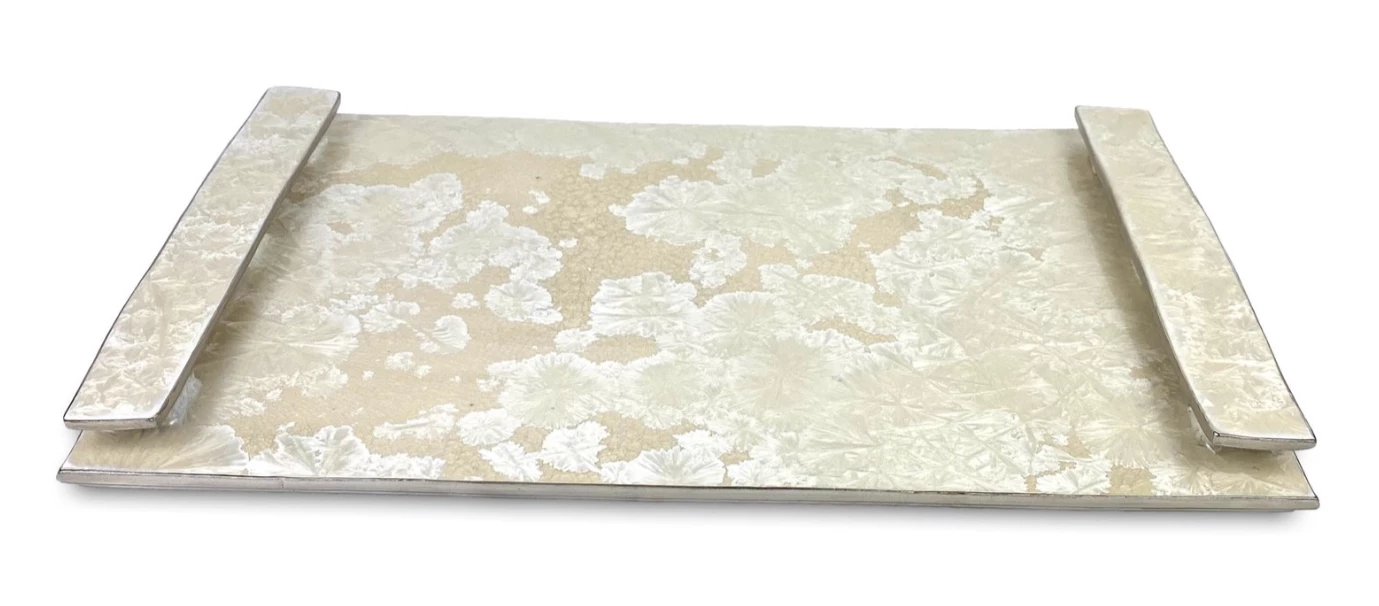The Borealis Tray is made of clay with a very cool crystal glaze, finished in 24K Platinum and handmade in the USA. Perfect as a cheese tray for serving starters or as decor, this tray is sure to attract attention. Food Safe, with a durable finish that is safe to cut on.