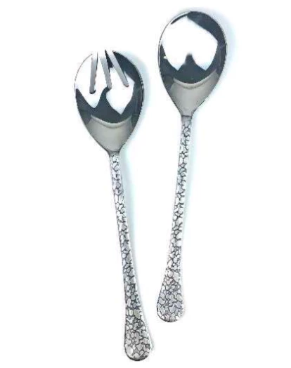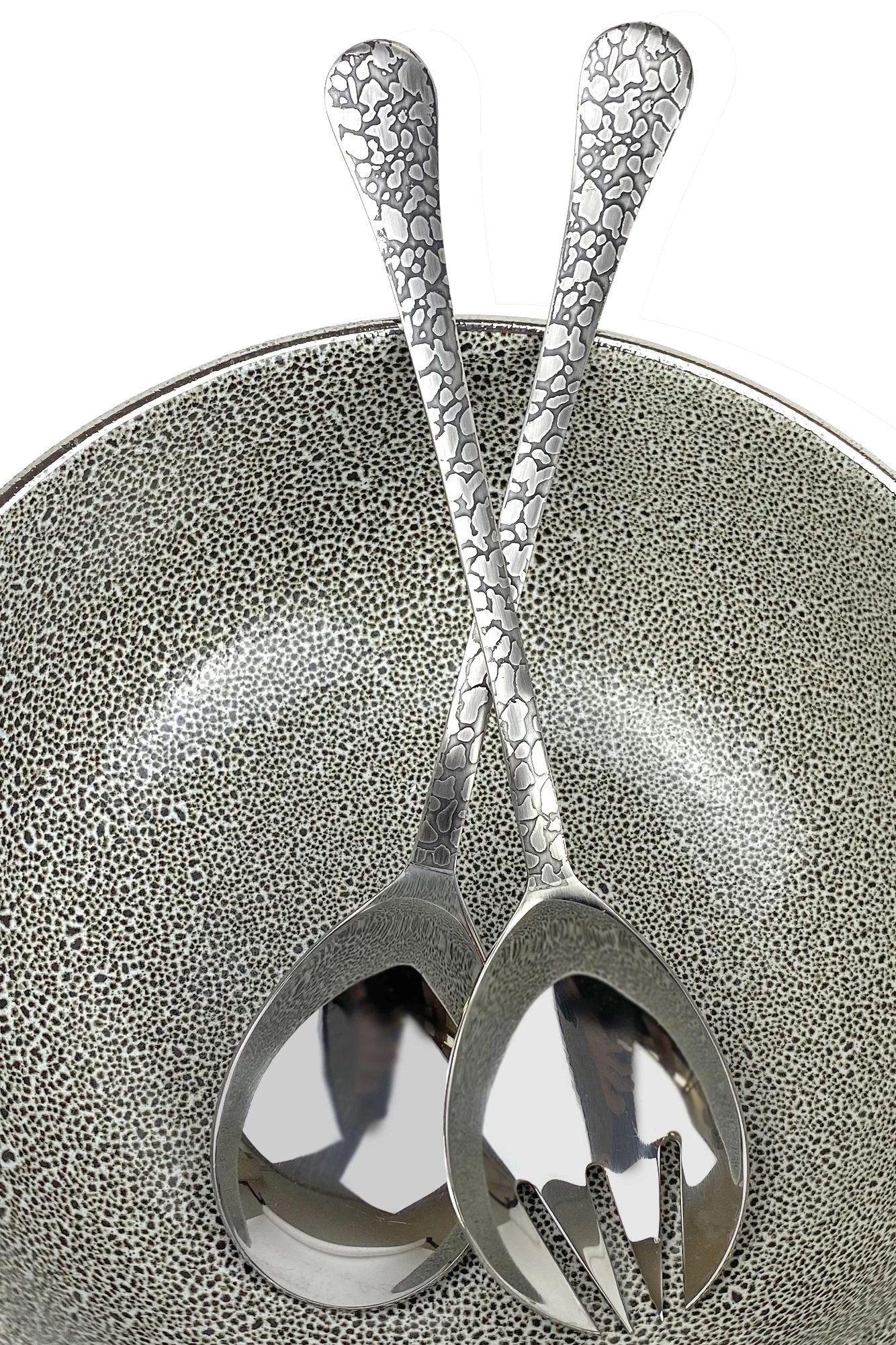METALLIC AND MOTTLED SHAGREEN-LIKE GLAZE DEFINES THIS SOPHISTICATED SALAD SERVING SET.