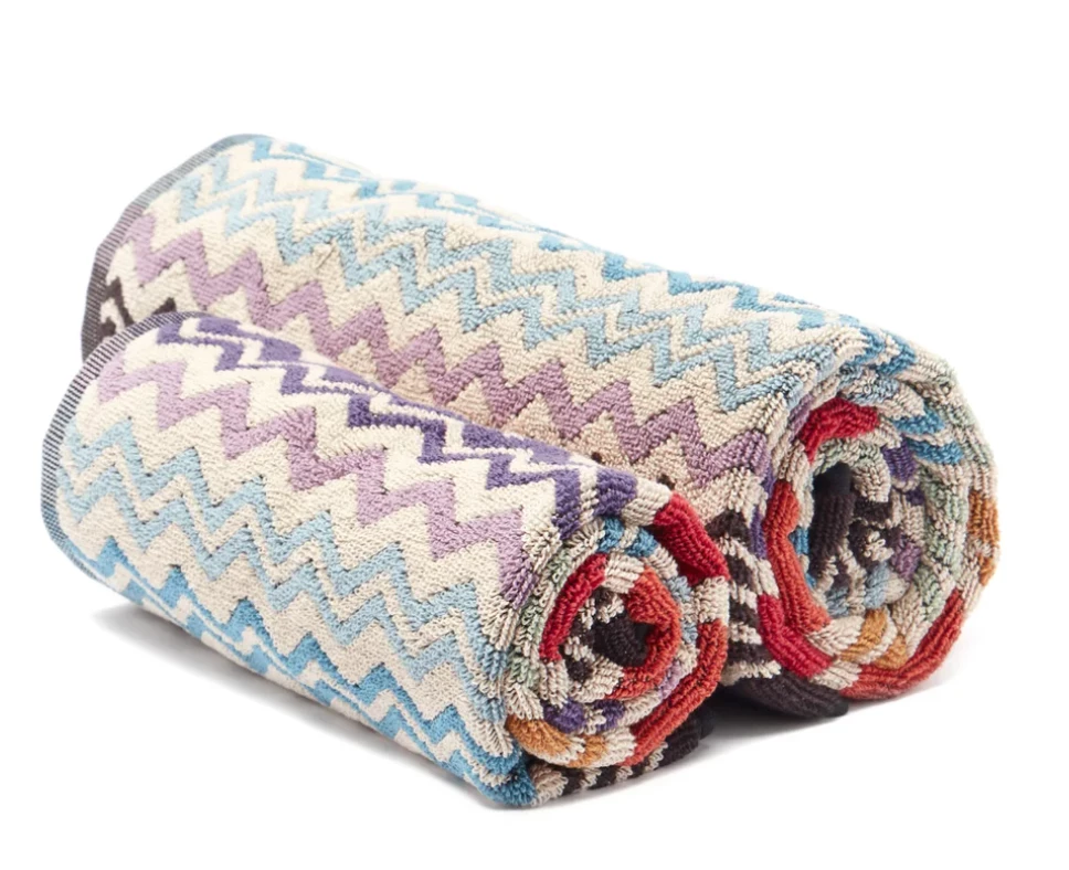 Bring a plush note to bathing rituals with Missoni’s Rufus Hand Towels. Crafted from impeccably soft and absorbent cotton terry, the towels feature a woven zigzag design in orange, blue, and purple.