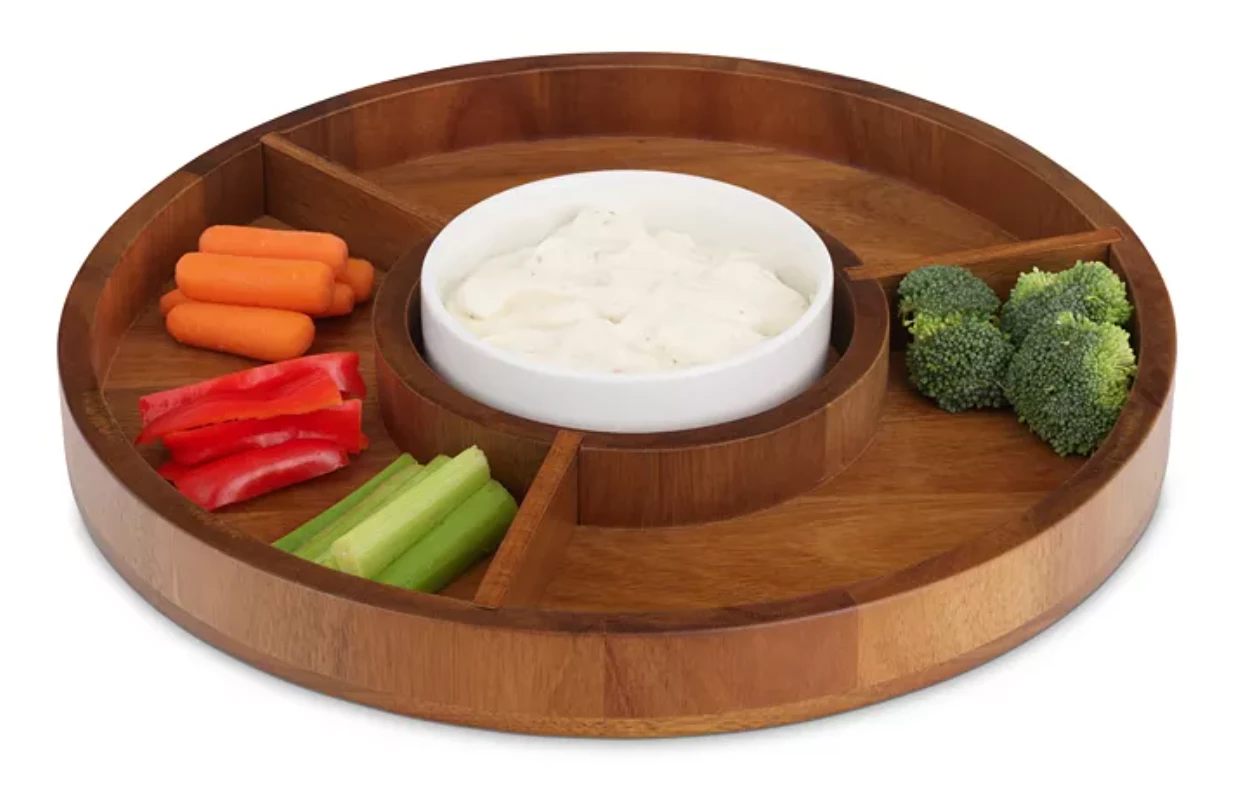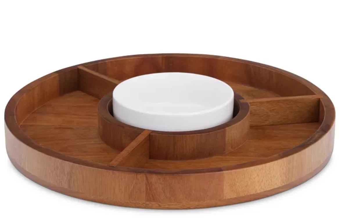 Entertain in style with this lazy susan, marrying warm acacia wood with white porcelain on a rotating wood base.