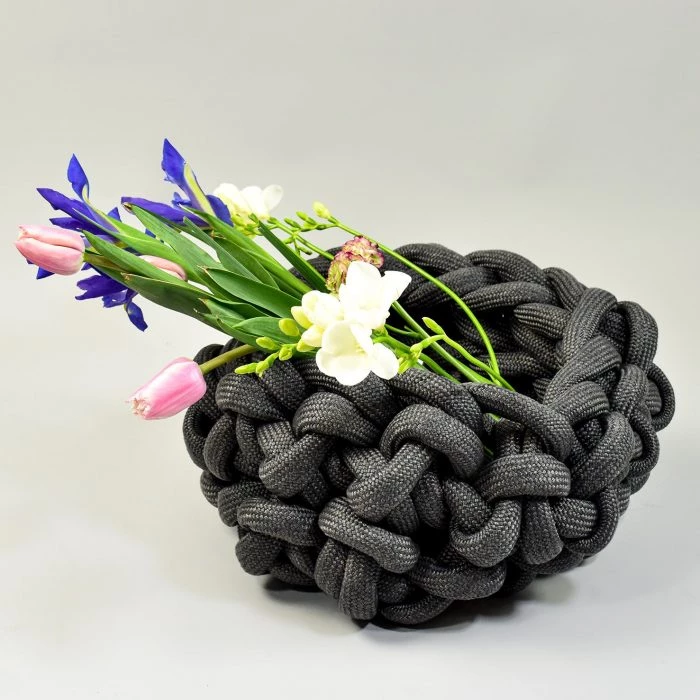 This impressive sculptured basket is hand-knotted with a high-tenacity polypropylene rope. Useful for storage or as decor.